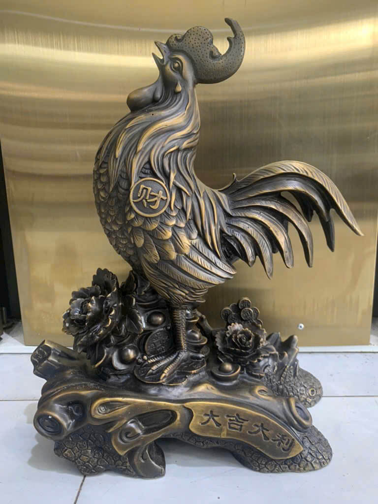 Tượng Gà Trống Hoa Hồng đứng trên bệ Tùng mang đậm ý nghĩa phong thủy: Gà trống tượng trưng cho may mắn, uy nghi và thăng tiến, còn cành tùng biểu trưng cho sức sống bền bỉ, trường thọ và sự vững vàng trước thử thách.